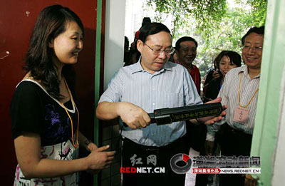 在考室內(nèi),梅克保查看了無線通信屏蔽設(shè)備,并掏出手機試了試,今年湖南每個考室都裝備了這樣的無線通信屏蔽儀,考試期間屏蔽設(shè)置將全部開啟。