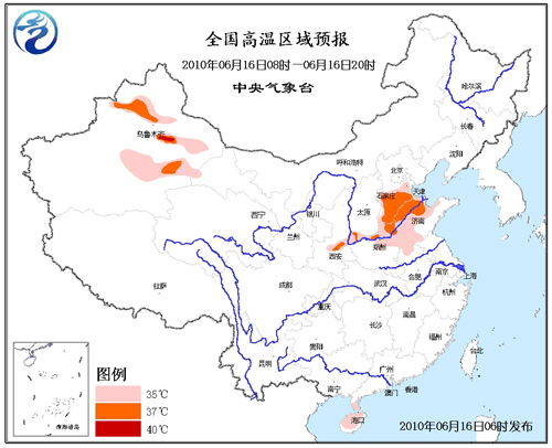 預(yù)計,今天白天,河北南部、天津西南部、山西西南部、河南北部、山東北部和西部、安徽北部、陜西關(guān)中地區(qū)以及廣東雷州半島、海南大部將有35~37℃的高溫天氣,其中,河北南部部分地區(qū)的最高溫度可達(dá)38℃;新疆北疆盆地以及南疆盆地將有35℃以上的高溫天氣,其中,吐魯番盆地最高氣溫可達(dá)40~43℃。