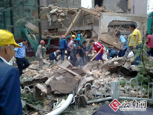 記者現(xiàn)場(chǎng)了解到,今天上午11時(shí)15分左右,云南飯店在拆遷過(guò)程中突然發(fā)生倒塌?繓|風(fēng)西路一邊正在被拆遷的一堵高大約7米的墻體砸向公交站臺(tái),一輛5路公交車(chē)正在站臺(tái)上下客,由于墻體離公交站臺(tái)非常近,正在下車(chē)的兩名乘客(一男一女)被砸傷。隨后,救護(hù)車(chē)迅速趕往現(xiàn)場(chǎng),目前,兩名傷者均已被送往醫(yī)院搶救,傷勢(shì)尚不清楚。