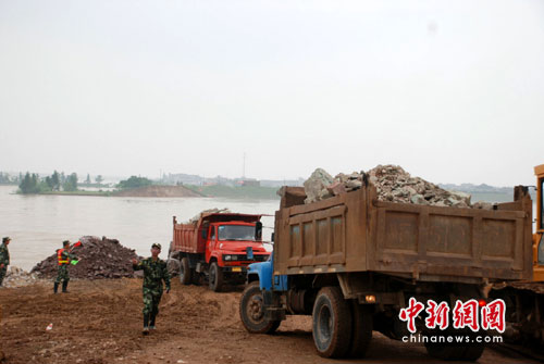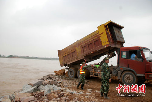 離決堤口不遠(yuǎn),武警水電部隊(duì)設(shè)立了臨時(shí)指揮部,再往前有武警戰(zhàn)士在指揮車(chē)輛卸倒石料,大塊大塊的礦石落入水中,砸起一朵朵浪花,旁邊還停留了一艘水文部門(mén)的監(jiān)測(cè)船。