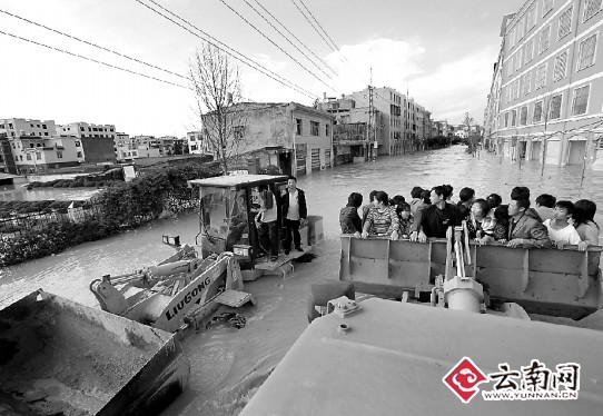 大水淹沒馬龍縣城的主街道之后,要進入城區(qū),又高又大的裝載機成了唯一的交通工具,也成了輪渡公交,城里地勢較高的地方成了碼頭。坐上這些裝載機,災(zāi)民們從城內(nèi)紛紛撤了出來……昨天,副省長孔垂柱到達馬龍考察災(zāi)情時,同樣是站在了裝載機上。而本報記者也一同爬上裝載機,一路進入城區(qū)。