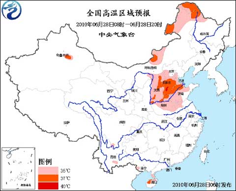 中新網(wǎng)6月28日電 中央氣象臺(tái)2010年6月28日06時(shí)繼續(xù)發(fā)布高溫藍(lán)色預(yù)警:預(yù)計(jì),今天白天,內(nèi)蒙古東北部和中部的部分地區(qū)、黑龍江西北部、山西、河北大部、天津、河南中北部、山東中西部、安徽北部、江蘇西北部、廣東雷州半島、海南北部等地有35~37℃、局地38℃的高溫天氣,其中,河北南部的局部地區(qū)最高氣溫可達(dá)40℃。