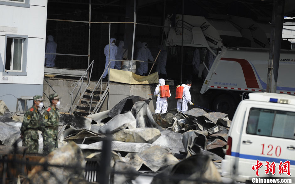吉林繼續(xù)對(duì)禽業(yè)公司火災(zāi)現(xiàn)場(chǎng)進(jìn)行消殺防疫處理