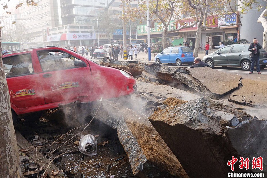 青島中石化一輸油管線(xiàn)發(fā)生破裂起火 路面被掀翻