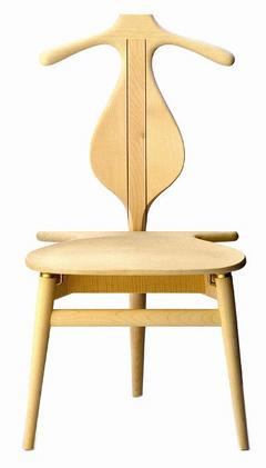丹麥傳奇家具設計師Hans J. Wegner的Valet椅,以純手工實木單椅詮釋“一物多用”的精神,這款榮獲紐約當代藝術館MOMA典藏的Valet椅,設計至今已超過55年,白天是外形美觀的舒適單椅,到了晚上就變成放置衣服的衣架,可將西裝與長褲掛在椅背與立起之椅面上,椅面下儲物空間則可收納皮帶與個人隨身物品。