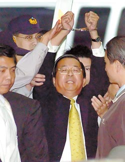 下午四點三十分陳水扁在走下特偵組時樓梯口,他收起不安的情緒高舉雙手,向媒體秀出上銬的雙手,大喊“政治迫害”、“司法冤獄”,并連續(xù)喊了兩次“臺灣加油”后,匆匆坐上特偵組公務(wù)車,直奔臺北地院。