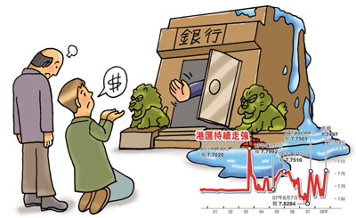 由于港匯不斷挑戰(zhàn)7.75的上限,有市場(chǎng)人士預(yù)期港府再度擴(kuò)寬聯(lián)匯波動(dòng)區(qū)間,以免無(wú)限量注資下去。金融界人士指出,于2004年外圍炒家借港元熱炒人民幣升值,令港匯走強(qiáng),終于在2005年5月將港元兌美元“保底不保頂”的聯(lián)匯政策作出微調(diào),擴(kuò)大至1美元兌7.85及7.75元保證范圍。