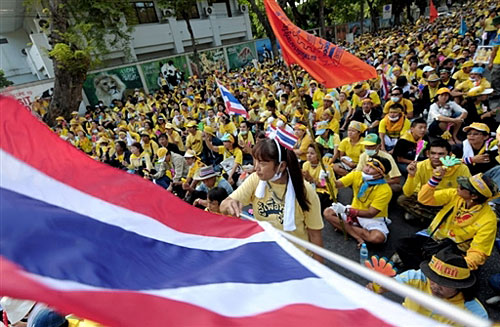 同日下午,數(shù)以萬(wàn)計(jì)“紅衫軍”在曼谷民主紀(jì)念碑附近廣場(chǎng)舉行集會(huì),他們身穿紅衣與穿黃衫的反對(duì)派壁壘分明。示威者揮舞國(guó)旗,戴寫(xiě)上“他信”、“不要政變”的紅色頭巾,聲稱支持前首相他信和政府,人數(shù)在當(dāng)?shù)貢r(shí)間晚上九時(shí)估計(jì)至少達(dá)到三萬(wàn)人!凹t衫軍”領(lǐng)袖表示:“我們齊集在這里以保護(hù)民主政制,我們不希望有政變!彼Q示威會(huì)舉行至十二月四日。