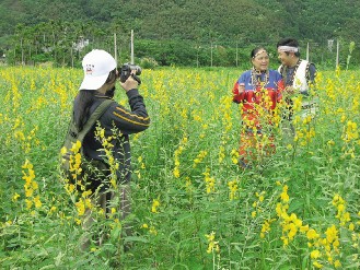 部分游客專程到秀林鄉(xiāng)記錄太陽麻花海景觀,身穿原住民賽德克族傳統(tǒng)服飾,置身在黃花綠葉的花海間,手持攝影機拍攝東海岸綠肥作物。