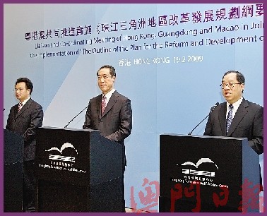 中新網(wǎng)2月20日電 《澳門日報》今日在頭條刊發(fā)報道稱,“粵港澳共同推進(jìn)實(shí)施《珠江三角洲地區(qū)改革發(fā)展規(guī)劃綱要》聯(lián)絡(luò)協(xié)調(diào)會議”19日在香港舉行,粵港澳三地就四個重點(diǎn)工作達(dá)成共識。