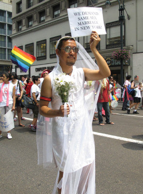 很多亞裔同志勇敢展示自己,其中不乏華裔身影。一位身穿結(jié)婚禮服的亞裔男同志,手舉“要求紐約承認(rèn)同性婚姻”的牌子,表達(dá)了同志們的呼聲。也有不少同志的支持者參加游行,梁淑儀支持身為女同志的姐姐梁淑安一起來(lái)游行,當(dāng)義工的劉健行和劉素夫婦表示有很多同志朋友,大家都是一樣的人,沒(méi)有什么不同。(劉爽)