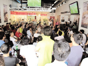 在南非世界杯舉辦期間,紐約華埠和小意大利區(qū)均沾著世界杯的喜氣,不少餐館、酒吧都在比賽時(shí)播放賽事,門外還有黑板寫上比賽兩隊(duì)介紹!跋愀壅尽笨觳偷晔侨A埠餐飲業(yè)首先這樣做的,餐館內(nèi)張貼了告示:“最低消費(fèi)4.25元,開賽前30分鐘至散場!鼻蛎远颊f值,因此每場賽事均座無虛席。11日荷蘭與西班牙爭桂冠,更加吸引球迷及準(zhǔn)球迷,餐廳內(nèi)爆滿,有的站在門外隔著玻璃看賽事,也感到過癮。