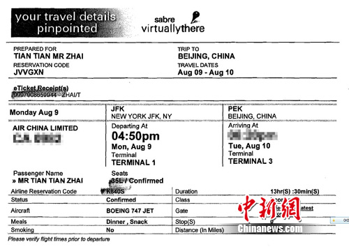 據(jù)了解,翟田田所乘坐的從紐約肯尼迪國際機(jī)場直飛中國北京的航班,將于10日下午抵達(dá)北京,屆時(shí)翟田田的親友將在北京接機(jī)。(完)