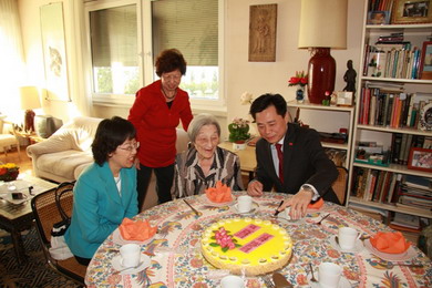 韓女士雖已年逾九十高齡,但精神矍鑠、談吐流利,依然時(shí)刻關(guān)注著中國(guó)的進(jìn)步和發(fā)展。在交談中,她衷心感謝吳大使夫婦專程趕來(lái)洛桑為其慶生,表示,使館的惦記和關(guān)懷讓她感到無(wú)比溫馨。她祝祖國(guó)繁榮昌盛,人民幸福安康。