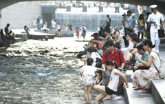 王某一家人從免稅店出來走向清溪川。清溪川是在中國也很有名的旅游景點。雖然是晚間時分,但天氣依然炎熱。王某的兩個兒子跳入水中。稍后而來的其他游客也脫掉鞋子進入水中。一位游客說:“很涼快,很舒服。孩子們也很喜歡。在城市中心建設(shè)小溪,感到很羨慕!