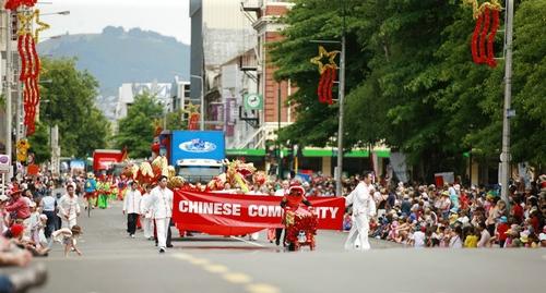 在醒目的“中華社區(qū)”英文橫幅后面,是幅面巨大的五星紅旗和新西蘭國旗。兩面旗幟都是3米寬5米長,合計面積達到30平方米,需要12個人共同擎舉,極為引人注目。華人隊伍聲勢浩大,鑼鼓喧天,紅旗招展,觀眾們看到隊伍過來,遠遠就開始熱情鼓掌歡迎,主持人還組織觀眾學著用中文齊聲高喊:“你好!”形成一股巨大的聲浪,向中華社區(qū)方陣致意,向基督城華人問好。
