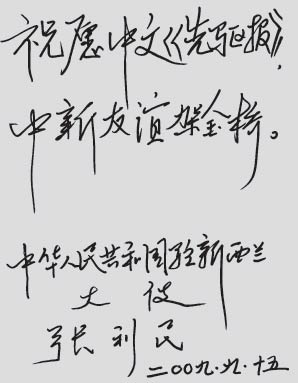 值此建國(guó)60周年之際,謹(jǐn)借《中文先驅(qū)報(bào)》之一隅,向大家的愛(ài)國(guó)愛(ài)鄉(xiāng)情懷深表贊賞和感謝,祝愿各位在事業(yè)上取得更大成績(jī),為中新友好做出新的貢獻(xiàn)。