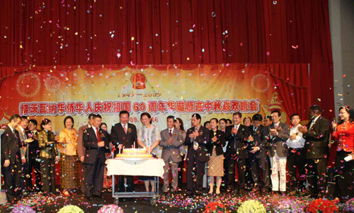 中新網(wǎng)9月20日電 據(jù)非洲《華僑周報》報道,16日,中國駐博茨瓦納大使館與旅博僑團(tuán)在首都哈博羅內(nèi)聯(lián)合舉行慶祝中國成立60周年暨迎中秋晚會。駐博大使劉煥興、經(jīng)商參贊宮和平、博茨瓦納中國和平統(tǒng)一促進(jìn)會會長喬良、博茨瓦納華商總會會長劉冰、博茨瓦納-中國友好協(xié)會執(zhí)行主席南庚戌以及福建同鄉(xiāng)會、江西同鄉(xiāng)會、馬翁僑社、中資企業(yè)協(xié)會等組織及僑胞代表共300余人歡聚一堂,共慶偉大祖國60周年華誕,共迎中秋傳統(tǒng)佳節(jié)。