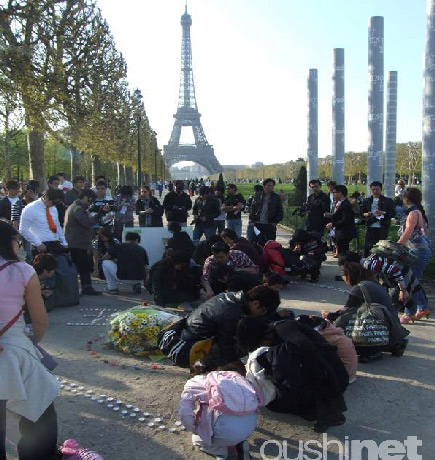 數(shù)百名在法留學(xué)生和華人于18日在巴黎艾爾菲鐵塔前的和平墻點(diǎn)起蠟燭,為青海玉樹地震的遇難者祈福。他們將數(shù)百支蠟燭擺成巨大的心形和“玉樹”字樣,然后逐一將蠟燭點(diǎn)燃,與此同時(shí),祈福板上也留下他們各式的祝福語,表達(dá)自己對(duì)災(zāi)區(qū)同胞們血脈相連的感情。望著燃燒的蠟燭,留學(xué)生和華人高呼“玉樹加油”,衷心的祈求青海玉樹地震中的生者平安,死者安息;顒(dòng)吸引不少路過的法國人和游人也停下腳步,為玉樹地震的死難者哀悼。