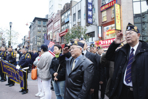 下午,紐約華裔美國退伍軍人會在華埠華裔軍人忠烈坊舉行另一個紀念儀式--向華裔軍人獻上花圈,呼吁人們勿忘華裔軍人對美國作出的貢獻。