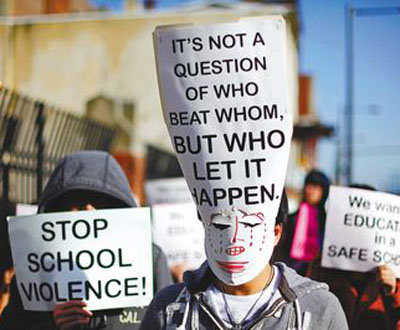 南費城高中亞裔學(xué)生、家長和華埠小區(qū)領(lǐng)袖百余人,9日下午手持“是誰讓它發(fā)生”等抗議標(biāo)語,游行至教育局參加公聽會,游行者高喊“停止學(xué)校暴力”、“給我安全教育環(huán)境”,抒發(fā)壓抑多時的不滿。