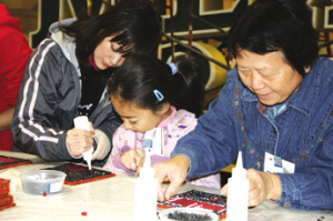 副會(huì)長(zhǎng)鹿強(qiáng)當(dāng)天全家上陣,包括岳父岳母和妻子兒女在內(nèi)的一家六口全都來(lái)到了粘花現(xiàn)場(chǎng),一起為世博會(huì)花車(chē)中國(guó)館模型粘貼由紅豆和黑豆組成的吉祥圖案,岳父方先生一邊干活一邊表示,能為世博會(huì)花車(chē)出一份力,這是他們?nèi)业淖院馈?/p>