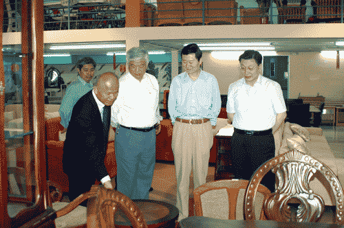 馬儒沛首先來(lái)到巴拿馬家具城,受到潘文亮董事長(zhǎng)和他兩位兒子的熱情接待,馬儒沛參觀了面積達(dá)九千多平方米的店面,深感驚嘆,他詳細(xì)地向潘文亮詢(xún)問(wèn)了關(guān)于家具市場(chǎng)的開(kāi)發(fā)、廠房擴(kuò)建、創(chuàng)立自主品牌、原材料成本等方面的問(wèn)題。