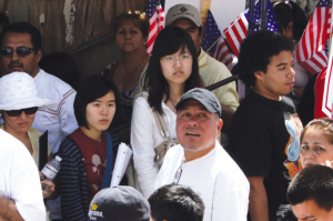和往年一樣,華裔民眾是移民大游行的旁觀者。當天的萬人大游行也不例外,在以西裔為主的的示威人群中,只能偶爾能夠看到一兩個華人的面孔。