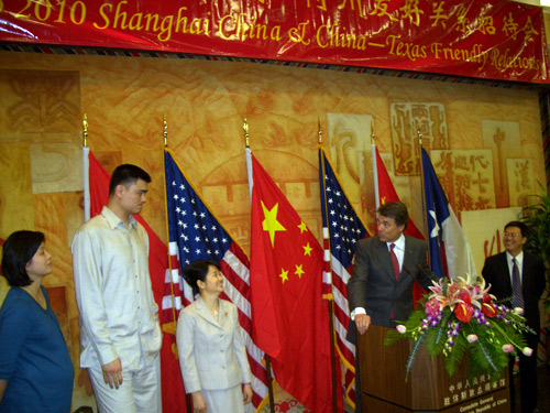 作為特別的嘉賓,姚明也發(fā)表了感言。他出生在上海,對上海有著特殊的感情。在德州休斯頓打球幾年來,他覺得也有必要向家鄉(xiāng)和祖國人民介紹德州“牛仔們”的生活和經(jīng)濟(jì)文化科技發(fā)展?fàn)顩r。他非常高興佩里州長能親自率團(tuán)參加上海世博會。