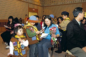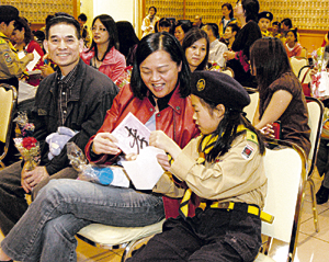 與丈夫史文山在教國際標(biāo)準(zhǔn)舞的沈柏容,在看到9歲的女兒史洛謙,送了張印有一個(gè)大大“孝”字的卡片和一大花束康乃馨時(shí),笑得合不攏嘴。佛光童軍小兄妹譚明駿和譚明麗,也各送了張“孝”卡給媽媽王淑芬。王淑芬說,能在佛光山收到子女的愛心卡和康乃馨,很有意義。