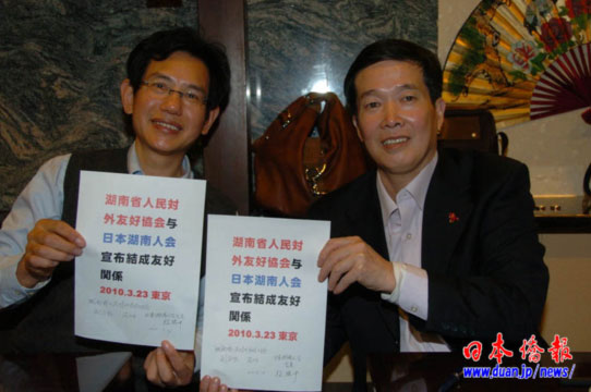 龐力平副會(huì)長(zhǎng)及訪日?qǐng)F(tuán)一行高度評(píng)價(jià)日本湖南人會(huì)的活動(dòng)搞得好,為推動(dòng)湖南與日本的交流做出了貢獻(xiàn),勉勵(lì)該會(huì)繼續(xù)努力,爭(zhēng)取更大的成績(jī)向家鄉(xiāng)人民匯報(bào)。在龐力平副會(huì)長(zhǎng)的提議下,日本湖南人會(huì)與湖南省人民對(duì)外友好協(xié)會(huì)當(dāng)場(chǎng)簽署了結(jié)為友好關(guān)系的文件。