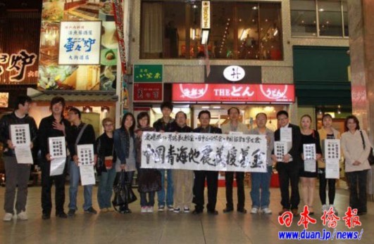 災情就是命令!災難無情,人間有愛!4月22日(星期四),愛媛松山一大早下起了多年未見的瓢潑大雨,但愛媛縣的同胞和日本友人仍然按照約定的時間,冒著大雨毅然走上街頭,開始了由聯(lián)合會帶頭部署倡導的聲勢浩大的街頭募捐活動。由三十多人組成的募捐隊伍,彼此不分中國人還是日本人,用真心與熱情共同譜寫、詮釋人間大愛——心向玉樹,情系災區(qū)!四幅由聯(lián)合會副會長、旅日山水畫家牛子華即時揮毫寫就的《愛媛縣華僑華人聯(lián)合會 中國留學生學友會 日中友好協(xié)會:為中國青海地震義援募金》的巨大橫幅在指定地點拉開了,募捐隊伍懷抱著十多個由聯(lián)合會事務局準備的專用募捐箱,拉開了活動的序幕!鞍萃袨橹袊嗪5卣馂膮^(qū)獻愛心”的募捐聲,聲聲入耳。向來對救災特別熱情的日本國民開始駐足慷慨解囊……和兩年前祖國汶川大地震賑災募捐情景同樣感人的一幕再次在同一地點重新演繹。我們禁不住熱淚盈眶——祈福災區(qū)人民!衷心感謝熱情、善良、友好的人們!第一天共募集到58,700日元。