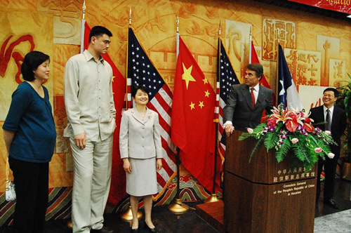 中新網(wǎng)4月28日電 據(jù)美國(guó)《美中信使報(bào)》報(bào)道,中國(guó)駐休斯頓總領(lǐng)事高燕平與美國(guó)德克薩斯州州長(zhǎng)里克.佩里于當(dāng)?shù)貢r(shí)間27日下午5時(shí)在總領(lǐng)館會(huì)議大廳舉辦“慶祝上海世博會(huì)和中國(guó)-得州友好關(guān)系”招待會(huì)。擔(dān)任上海世博會(huì)形象大使的中國(guó)著名籃球明星姚明和他的妻子葉莉以及當(dāng)?shù)厝A人僑領(lǐng)及學(xué)界代表200余人應(yīng)邀出席招待會(huì)。