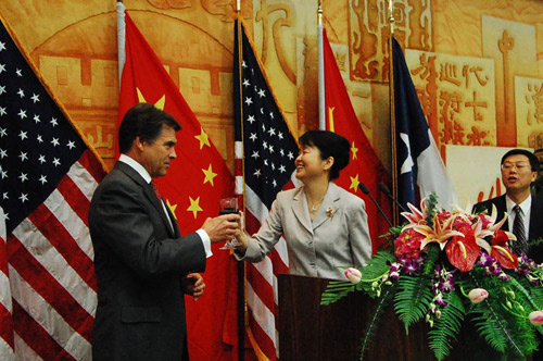 高燕平總領(lǐng)事在招待會(huì)上分別用中文和英語(yǔ)致辭,對(duì)佩里州長(zhǎng)以及來(lái)自德州各界的美國(guó)朋友及華裔同胞表示熱烈的歡迎。這次世博會(huì)德克薩斯州將通過(guò)世博園里的美國(guó)館,向全中國(guó)和全世界展現(xiàn)自己。高燕平表示希望通過(guò)佩里州長(zhǎng)6月份的訪華,進(jìn)一步推動(dòng)中國(guó)與德州在各領(lǐng)域的交流與合作,希望佩里州長(zhǎng)的訪問(wèn)順利成功并富有成果。