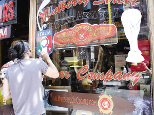 逛小意區(qū)時(shí),看見一個(gè)禮品店小伙子在門外圖畫意大利隊(duì)隊(duì)徽和大力神杯。一名賣球衣的華人表示,雖然現(xiàn)在小意區(qū)還不太“熱”,但到意大利隊(duì)出場(chǎng)那天,整個(gè)小意區(qū)都會(huì)瘋起來,那時(shí)球衣就好賣了。