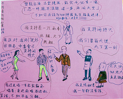 張貼在飲食中心周?chē)挠嘘P(guān)漫畫(huà)大字報(bào)顏色非常鮮艷,內(nèi)容都是以“馬華武林大會(huì)”、“支持特大”、“翁大使要第一劍”、“中委會(huì)不支持特大”、及“雙龍出海,混云卷風(fēng),龍虎斗,必有一傷”,及勸人退一步海闊天空等字眼。
