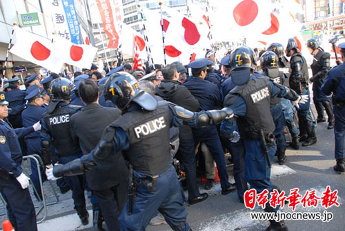 中新網(wǎng)1月10日電 據(jù)《日本新華僑報》報道,10日,日本右翼團體在東京池袋中國人物產(chǎn)店——“陽光城”物產(chǎn)店前舉行的抗議活動計劃,在警方的阻止下沒有得逞。