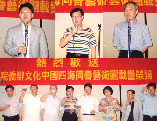 中國駐菲大使館白天代辦,王軍領(lǐng)事等使館領(lǐng)導(dǎo),藝術(shù)團(tuán)團(tuán)長熊昌良,藝術(shù)團(tuán)全體演員和菲華各界聯(lián)合會(huì)名譽(yù)主席,常務(wù)委員、委員等出席了歡送宴會(huì)。中國駐菲大使館白天政務(wù)參贊、藝術(shù)團(tuán)團(tuán)長熊昌良,菲華各界聯(lián)合會(huì)主席戴宏達(dá)先后致詞。該會(huì)委員們與藝術(shù)家們歡聚一堂,大家觸光交錯(cuò),氣氛熱烈。