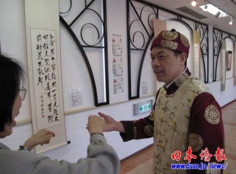 這位濃眉大眼的大漢,是湖南岳陽人,眉宇間有一股坦蕩之氣逼人?傋尮P者懷疑是武林中人。就是這位,自2001年來日本傳播指書文化,短短10年間,已是列島上下,上至國家政要,下至普通市民,爭相結交的人氣者。