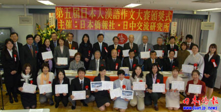 “第五屆日本人漢語作文大賽”共有36名應征者獲獎,中國駐日使館許澤友總領事代表程永華大使為川松若菜(學生組)和佐藤美緒子(社會組)頒發(fā)了“中國大使獎”。