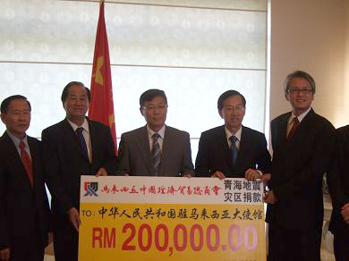 中新網(wǎng)5月6日電 據(jù)中國外交部網(wǎng)站消息,近日,馬來西亞馬中經(jīng)貿(mào)總商會、馬華公會公共服務(wù)及投訴局以及華商Yap Kim San 先生前來中國駐馬來西亞使館,轉(zhuǎn)交向青海玉樹地震災(zāi)區(qū)捐款。