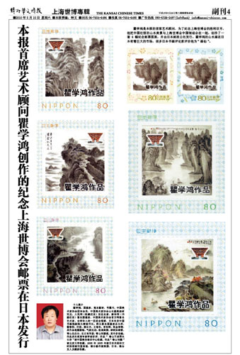 中新網(wǎng)5月18日電 據(jù)日本《關(guān)西華文時(shí)報(bào)》報(bào)道,5月15日,該報(bào)首席藝術(shù)顧問(wèn)曲學(xué)鴻創(chuàng)作的紀(jì)念上海世博會(huì)郵票在日本發(fā)行。為了紀(jì)念上海世博會(huì)的勝利召開(kāi),他把中國(guó)壯麗的山水美景與上海世博會(huì)中國(guó)館結(jié)合在一起進(jìn)行繪畫(huà)創(chuàng)作,創(chuàng)作了一套6幅紀(jì)念郵票圖案,并由日本郵便株式會(huì)社發(fā)行。