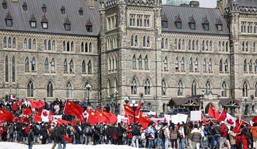 此間媒體發(fā)自現(xiàn)場的報(bào)道說,渥太華國會(huì)山莊已經(jīng)變成紅色的海洋,到處飄揚(yáng)著五星紅旗和楓葉旗。組織者估計(jì),與會(huì)人數(shù)可能會(huì)超過預(yù)期,示威人群幾乎站滿了國會(huì)山莊前的草坪。
