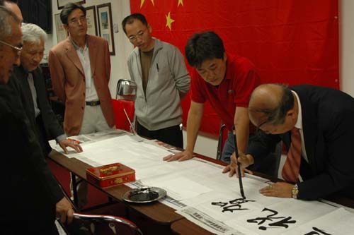 神七發(fā)射成功慶祝會(huì)上,美國福州竹歧同鄉(xiāng)會(huì)秘書長鄭時(shí)浩即興揮毫。