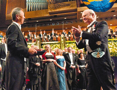 中新網(wǎng)12月11日電 2009年諾貝爾獎(jiǎng)?lì)C獎(jiǎng)禮昨在瑞典斯德哥爾摩演奏廳舉行,一生獲獎(jiǎng)無數(shù)的光纖之父、前香港中文大學(xué)校長(zhǎng)高錕,正式從瑞典國(guó)王古斯塔夫.卡爾16世(Carl XVI Gustaf)手中接過諾貝爾物理學(xué)獎(jiǎng)。期間大會(huì)更為他作出特別安排,由國(guó)王走到其座位旁邊頒獎(jiǎng),盛裝出席的他,以燦爛的笑容迎接氣氛莊嚴(yán)但歡樂的歷史性一刻。