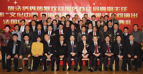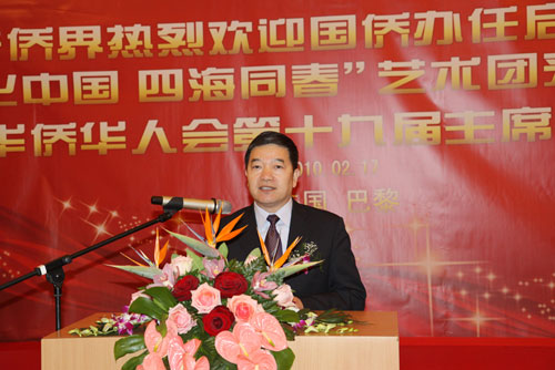 中新網(wǎng)2月18日電 當(dāng)?shù)貢r(shí)間17日晚,法國(guó)巴黎5區(qū)互助之家宴會(huì)廳花團(tuán)錦簇,一片歡歌笑語(yǔ)。旅法僑界在此舉行盛大招待會(huì),歡迎以中國(guó)國(guó)務(wù)院僑辦副主任任啟亮為團(tuán)長(zhǎng)的“文化中國(guó) 四海同春”藝術(shù)團(tuán)抵達(dá)巴黎,將為華僑華人和法國(guó)各界友人奉獻(xiàn)一臺(tái)中華文化藝術(shù)的盛宴。