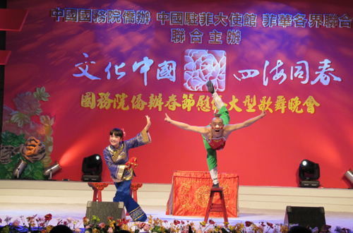 中新網(wǎng)2月25日電 由國務院僑辦和中國海外交流協(xié)會組派的“文化中國·四海同春”2010年春節(jié)赴菲律賓藝術小組在宿務進行了精彩的演出。濃郁的民俗文化氣息,精湛的演藝水平,受到了當?shù)貎S胞的極大贊譽。