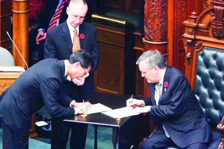 中新網(wǎng)11月1日電 據(jù)加拿大《明報(bào)》報(bào)道,競選連任成功的加拿大安省省長麥堅(jiān)迪10月30日率領(lǐng)新內(nèi)閣宣誓就任。華裔省議員陳國治再上層樓,被麥堅(jiān)迪委以重任,出任安省公民及移民廳廳長,成為安省內(nèi)閣的一名重要成員。陳國治在宣誓就任的儀式結(jié)束后向中文媒體表示,感謝省長給他這個(gè)機(jī)會(huì),可以為安省的新移民、新公民服務(wù)。
