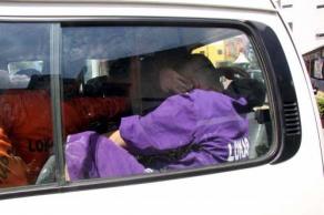 涉嫌謀殺案件的男子以手遮掩臉部,不讓攝影記者拍攝他的樣子。坐在中間的孫櫓華則直視前方,臉上沒有太多的表情。(圖:星洲日報)