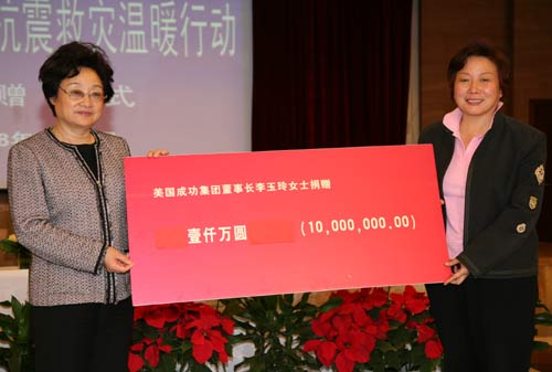 3、美國(guó)成功集團(tuán)董事長(zhǎng)李玉玲捐贈(zèng)1000萬(wàn)元人民幣;